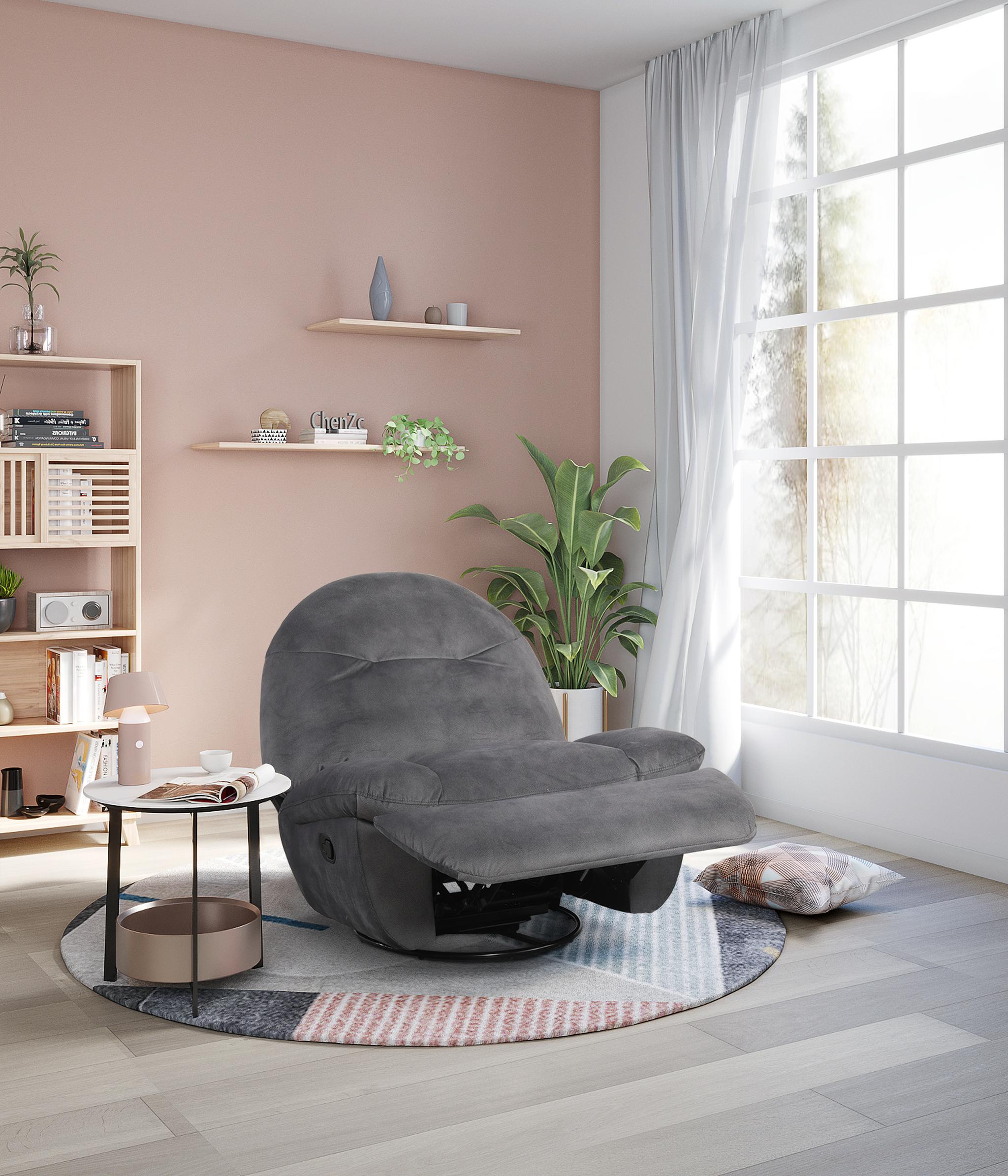 Rumi is a manual recliner armchair with a calm, unhurried feel. Choose your position by hand, then relax with soothing swivel and rocking motion. Built in tech fabric, it’s sized for nooks and small spaces, making it an easy favorite.