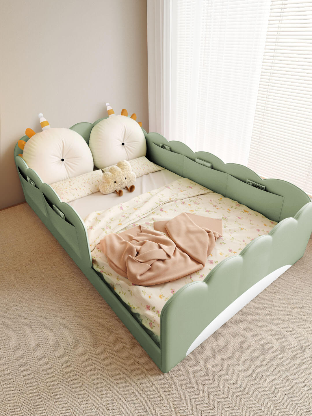 Make bedtime easy and safe with this children’s floor bed - crafted low to the ground, with safety fences and a sleeve holder for books, toys, and cozy essentials.
