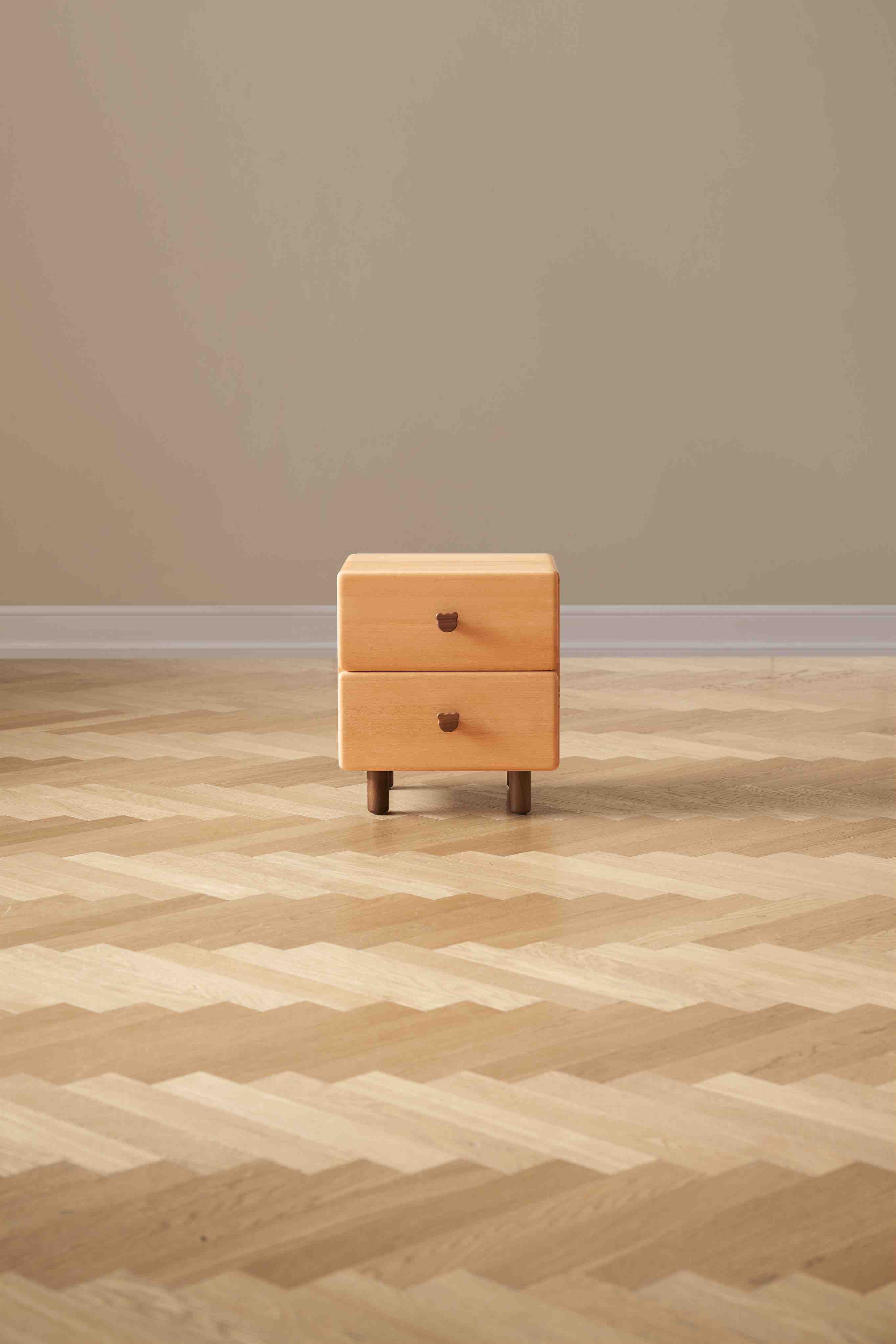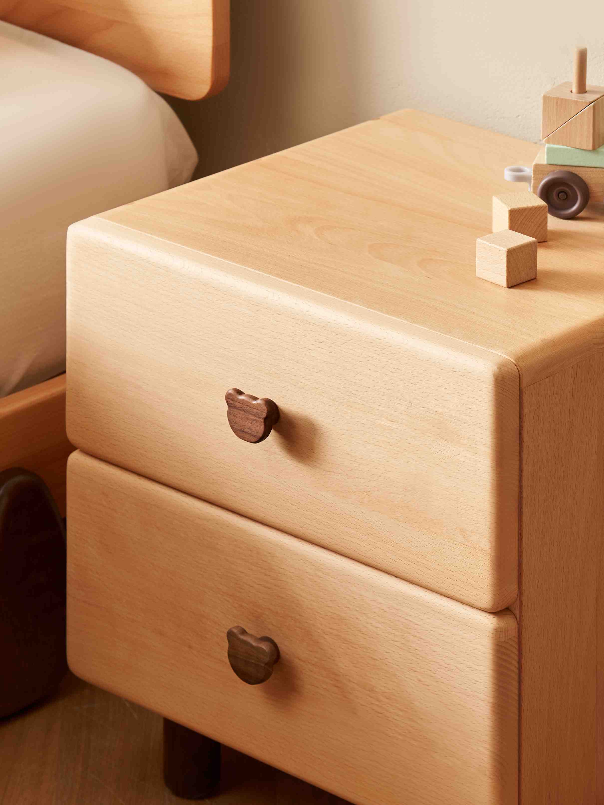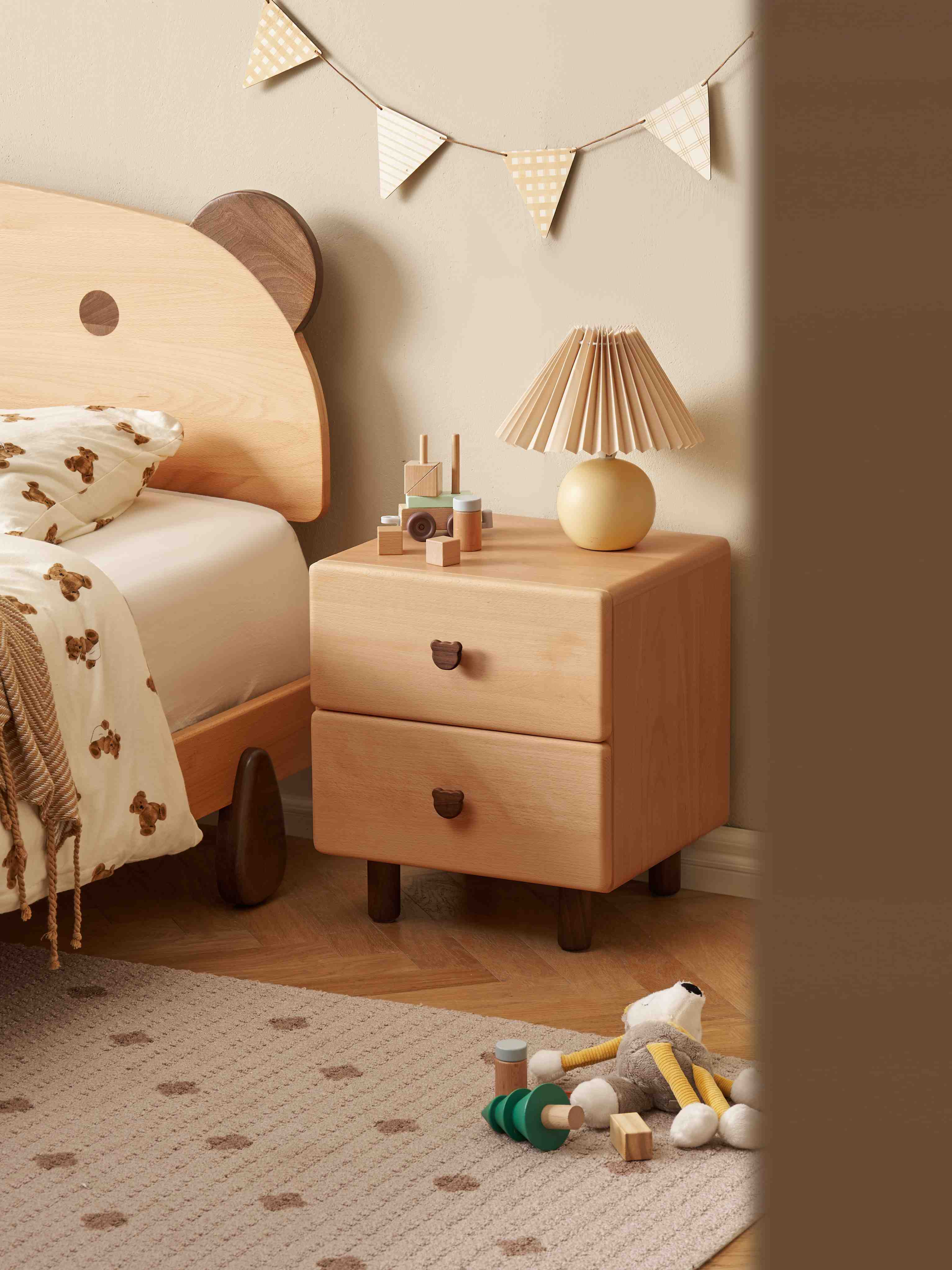 Invest in a childrens bedside table that stands the test of time. Made from premium, dent-resistant beech wood, this nightstand features a unique bear handle and a smooth, safe finish. A charming yet heavy-duty addition to any child's bedroom or nursery.