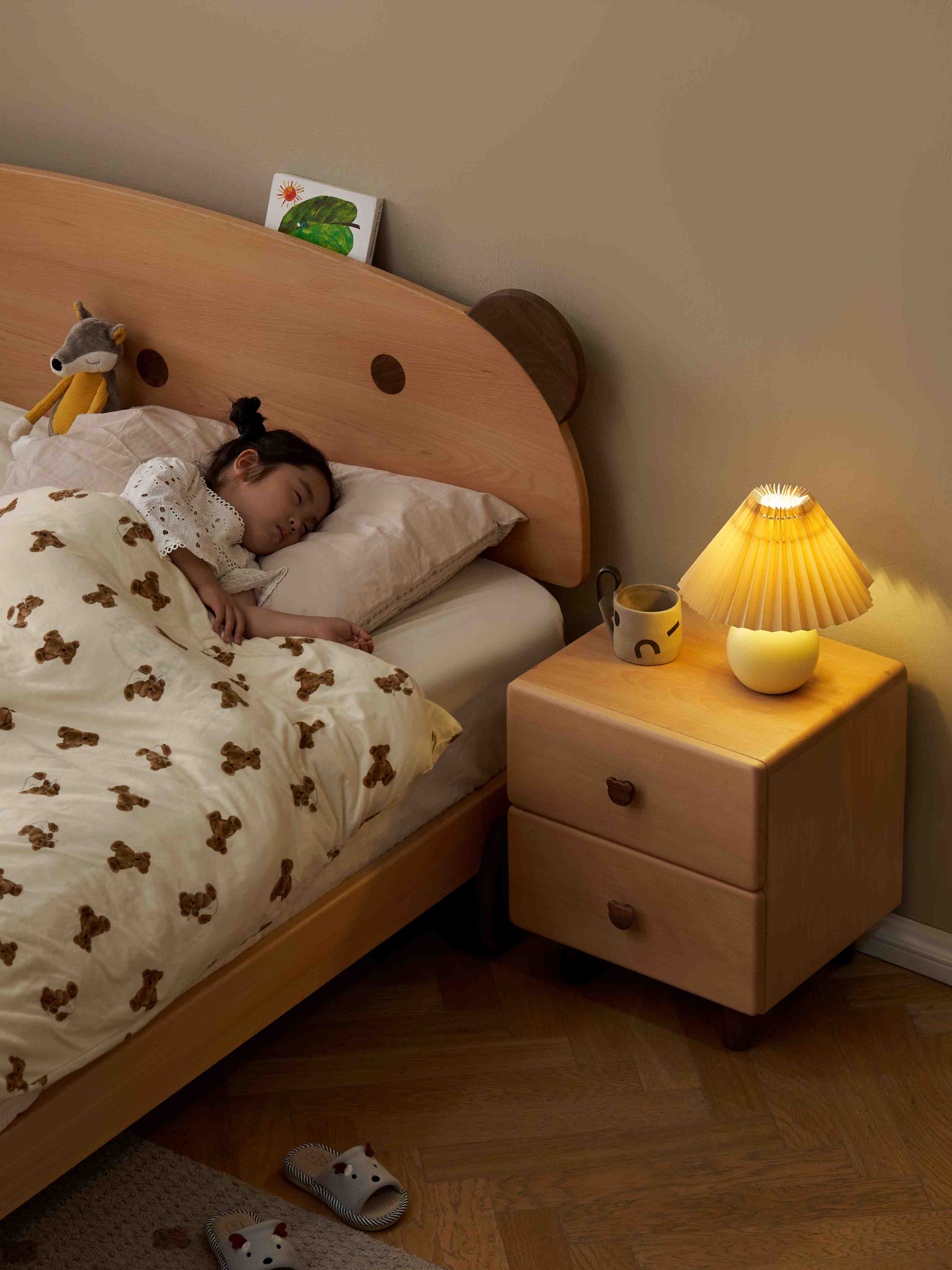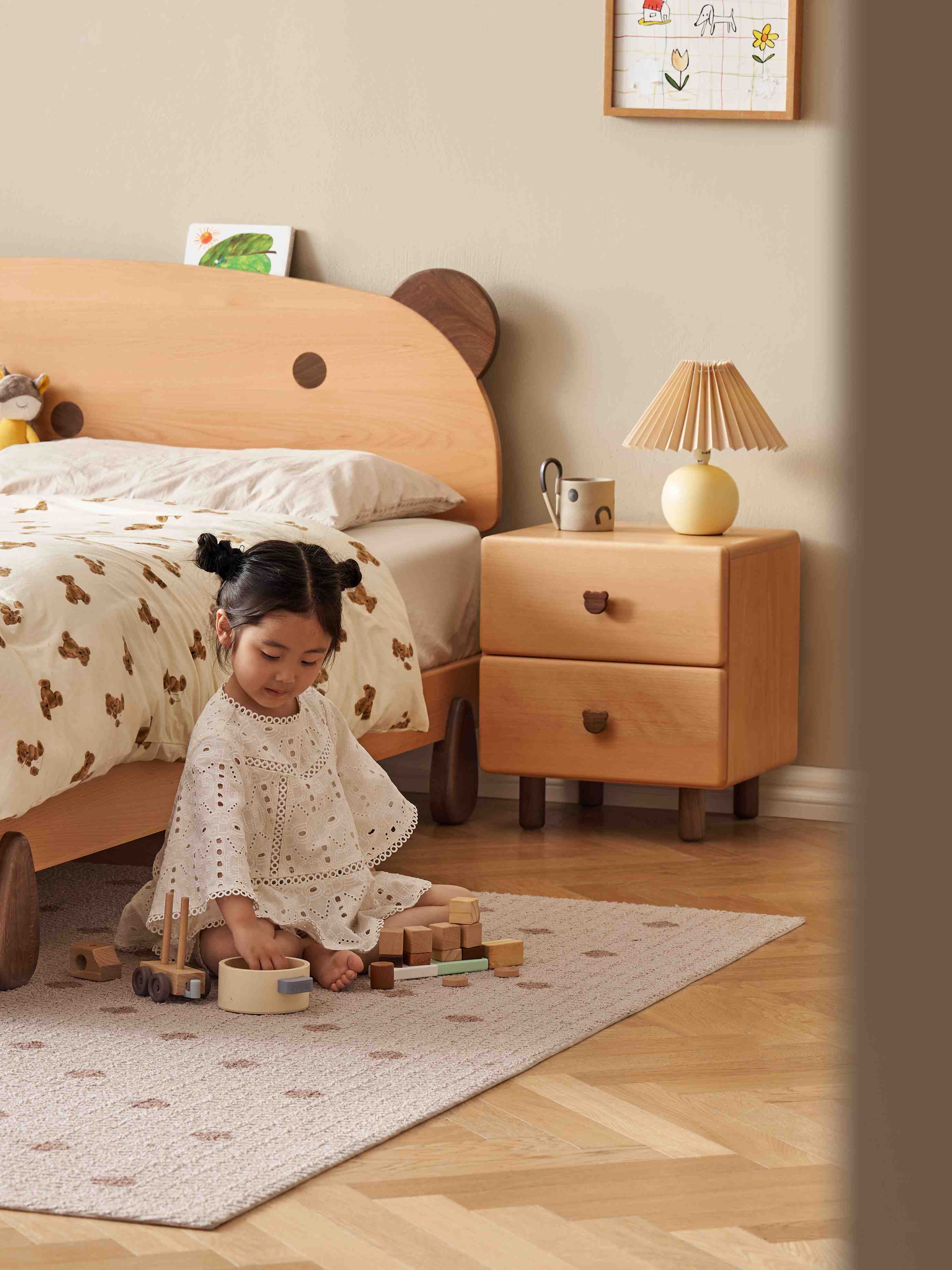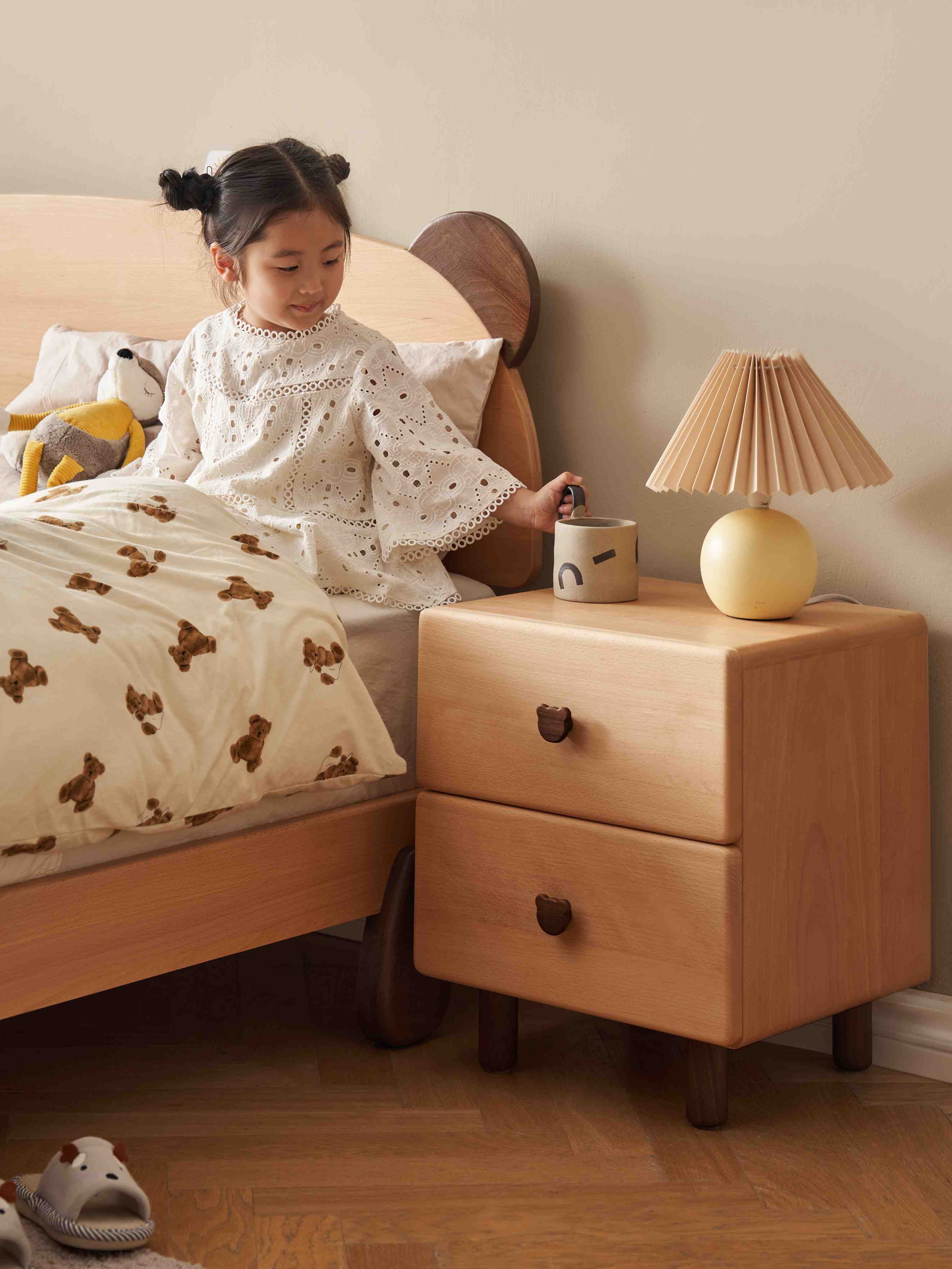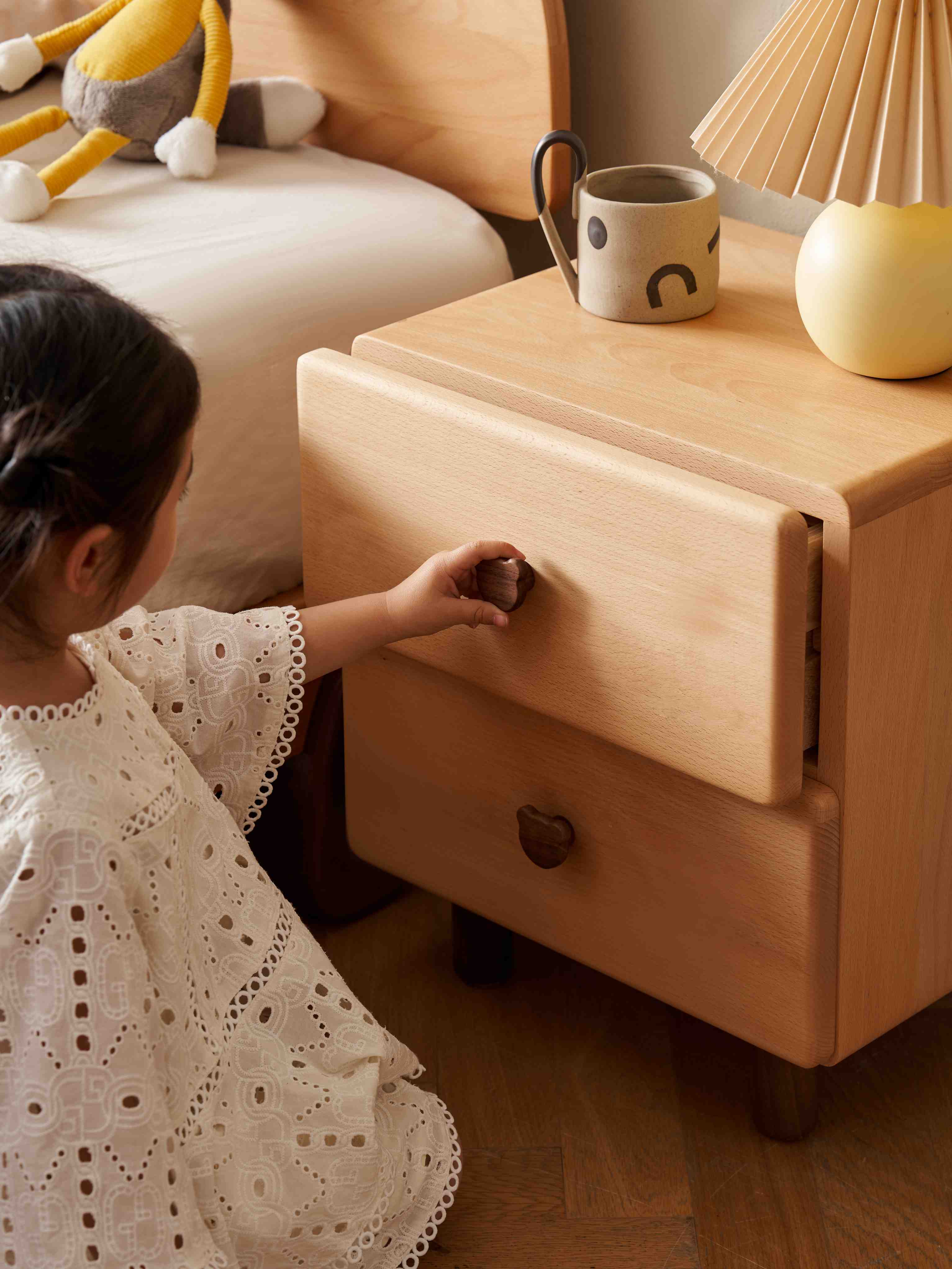 Invest in a childrens bedside table that stands the test of time. Made from premium, dent-resistant beech wood, this nightstand features a unique bear handle and a smooth, safe finish. A charming yet heavy-duty addition to any child's bedroom or nursery.